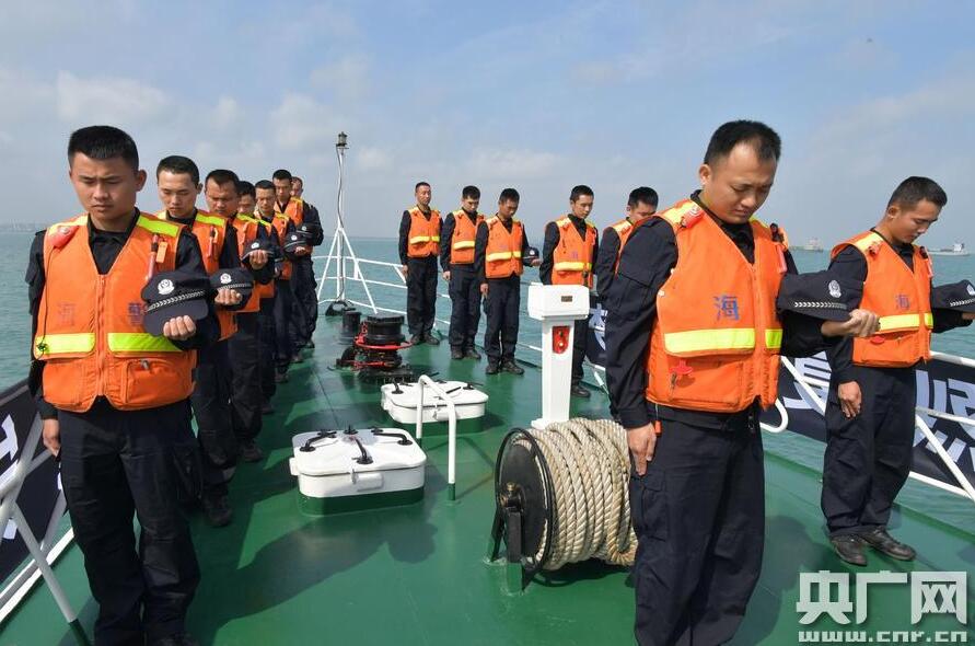 3月30日上午,海南海警一支隊組織官兵在瓊州海峽開展“海上祭英烈”活動。 攝影:吳意