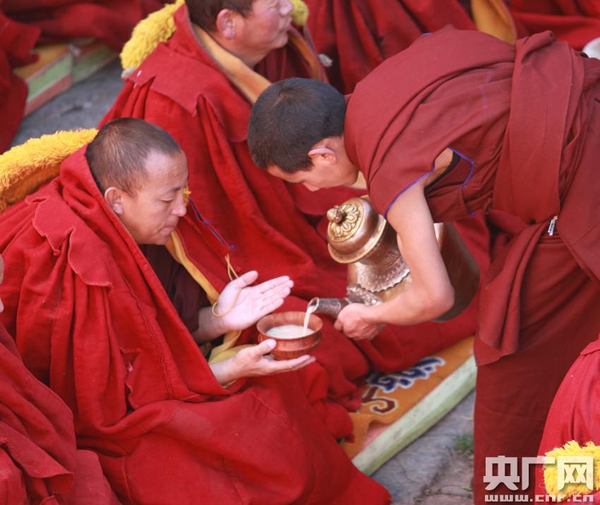 立宗答辯儀式上僧人正在給參加答辯的僧人們獻酥油茶(央廣網(wǎng)發(fā) 普布次仁 攝) -