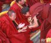 僧人們正在給考僧出題(央廣網(wǎng)發(fā) 普布次仁 攝) 央廣網(wǎng)拉薩4月7日消息(記者普布次仁)2017年度藏傳佛教學(xué)經(jīng)僧人考核晉升格西拉讓巴學(xué)位立宗扮證儀式今日上午在拉薩市大昭寺主殿前舉行,10名來自西藏各大寺廟的主要經(jīng)師獲得格西拉讓巴學(xué)位。 格西拉讓巴是藏傳佛教格魯派僧人修學(xué)顯宗的最高學(xué)位,共分多讓巴格西、林斯格西、措讓巴格西和拉讓巴格西四個等級。此次立宗活動是在西藏自治區(qū)民族宗教事務(wù)部門的指導(dǎo)下,由中國佛協(xié)西藏分會具體組織實施。2017年度藏傳佛教學(xué)經(jīng)僧人考核晉升格西拉讓巴學(xué)位夏季考試已于2016年8月12日至18日在甘丹寺圓滿完成,來自拉薩哲蚌寺的考僧堅才朗珍以優(yōu)異的成績?nèi)〉昧?017年度格西拉讓巴第一名。拉薩市色拉寺土登曲增、日喀則市扎什倫布寺洛桑堅才、昌都市八宿寺強巴阿旺,強堆寺益西頓珠、那曲地區(qū)熱登寺旦增普桑、拉薩熱堆寺群培塔青,甘丹寺洛桑堅才、昌都察雅煙多寺加央土登、那曲瓊科寺阿旺云旦等考僧分別獲得了第二至十名。 據(jù)了解,今年的立宗活動是繼2004年恢復(fù)開展藏傳佛教學(xué)經(jīng)僧人考核晉升格西拉讓巴學(xué)會工作以來的第十三次活動。頒證儀式上西藏自治區(qū)領(lǐng)導(dǎo)向獲得學(xué)位的考僧們贈送了五彩段、袈裟和禮金。自治區(qū)政協(xié)副主席、中國佛協(xié)西藏分會會長珠康·土登克珠介紹:“本年度的考僧都是博學(xué)多才、宗教學(xué)識深厚,精通《五部大論》。這次立宗活動呈現(xiàn)出參加考核晉升格西拉讓巴學(xué)位的寺廟最多,考僧們的宗教造詣高,考試競爭激烈,表現(xiàn)突出等特點! -