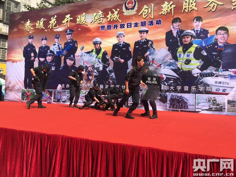 民警現場表演徒手擒拿(央廣網記者 陳鵬 攝) 央廣網重慶4月15日消息(記者陳鵬)為增進對公安民警的理解及支持,不斷拓展公安機關與人民群眾溝通聯系渠道,扎實推進新時期和諧警民關系建設。4月14日下午,重慶北碚公安分局在嘉陵風情步行街舉辦了2017年第一季度“警營開放日”活動;顒又胁粌H有來自西南大學音樂學院的大學生帶來的歌舞表演,公安民警還擺出展臺,展示槍械、軍用無人機等,現場給市民講解“警營的豐富生活”。 此次“警營開放日”活動以“春暖花開暖碚城,創(chuàng)新服務系民生”為主題,緊緊圍繞窗口服務、便民提醒、法制宣傳、安全防范、裝備展示、警務公開,警民互動等相關內容展開。交巡警支隊、出入境管理支隊和人口管理支隊的窗口民警,結合警務工作實際,在現場講解了《車輛服務指南》、《出入有境 服務無境》和《身份證的知識》等內容;顒舆邀請了西南大學音樂學院和分局特警支隊參現場與表演。 活動期間,共發(fā)放宣傳資料2000余份,發(fā)放便民雨傘200把,接受群眾咨詢200余次, 近2000余名群眾參與;顒釉鰪娏巳嗣袢罕姷陌踩婪兑庾R,提高市民安全防范能力,及時回應廣大人民群眾對公安機關的新期待、新要求,展示新時期公安機關立警為公、執(zhí)法為民的良好形象,提升了轄區(qū)群眾的滿意度和安全感。 -