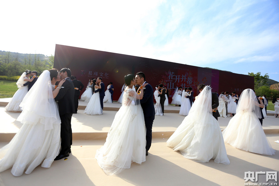 新人們在集體婚禮現(xiàn)場相擁親吻(央廣網記者 魏煒 攝)