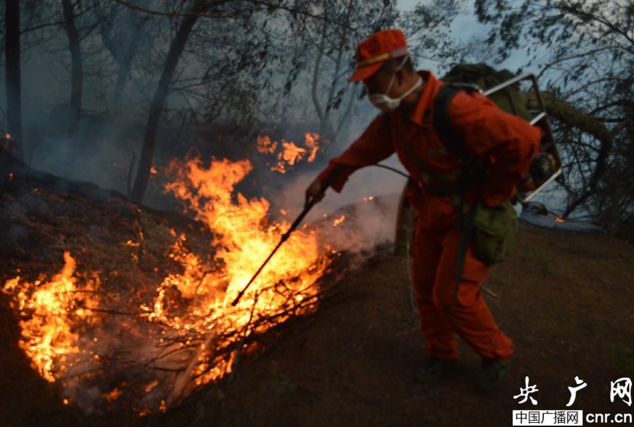 接到命令后,該支隊(duì)張福昌參謀長(zhǎng)帶前指5人及直屬大隊(duì)90名官兵火速向火場(chǎng)開進(jìn);18時(shí)30分,該支隊(duì)張志廣政委帶機(jī)關(guān)、警勤中隊(duì)20名官兵也趕赴火場(chǎng)增援。19時(shí),部隊(duì)到達(dá)火場(chǎng)后,經(jīng)現(xiàn)場(chǎng)勘察,火勢(shì)為低強(qiáng)度穩(wěn)進(jìn)地表火,火場(chǎng)植被主要以云南松、低矮灌木為主,火場(chǎng)為山林地,海拔2067米,火場(chǎng)氣溫約25度,東南風(fēng)2-3級(jí),坡度35度。19時(shí)10分,部隊(duì)結(jié)合風(fēng)向穩(wěn)定,風(fēng)力較小的實(shí)際,采取“兩翼對(duì)進(jìn),鉗形夾擊”的戰(zhàn)術(shù),由張福昌參謀長(zhǎng)、直屬大隊(duì)林航代理大隊(duì)長(zhǎng)帶一中隊(duì)45名官兵沿西南方向進(jìn)行撲打,直屬大隊(duì)林雪教導(dǎo)員帶二中隊(duì)40名官兵沿西北方向撲打。19時(shí)50分,支隊(duì)張志廣政委帶20名官兵到達(dá)火場(chǎng),并迅速投入滅火戰(zhàn)斗。