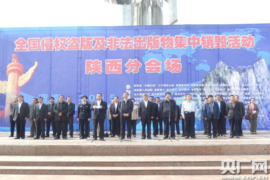2015年全國侵權(quán)盜版及非法出版物集中銷毀活動(dòng)陜西分會(huì)場(chǎng)活動(dòng)在渭南市中心廣場(chǎng)舉行。(央廣網(wǎng)記者 溫超 攝)