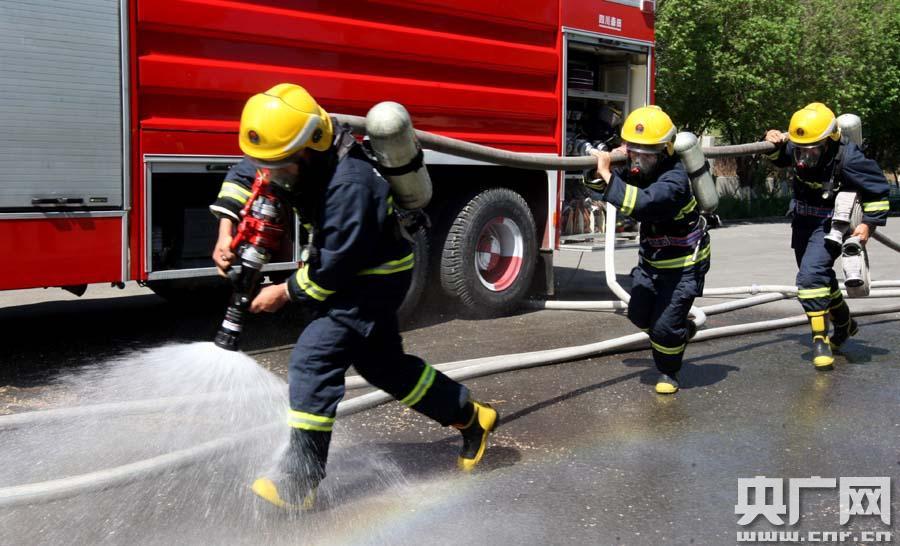 消防戰(zhàn)士參加攻堅組百米梯次進攻操科目的比賽(央廣網(wǎng)發(fā) 周建玲 攝)