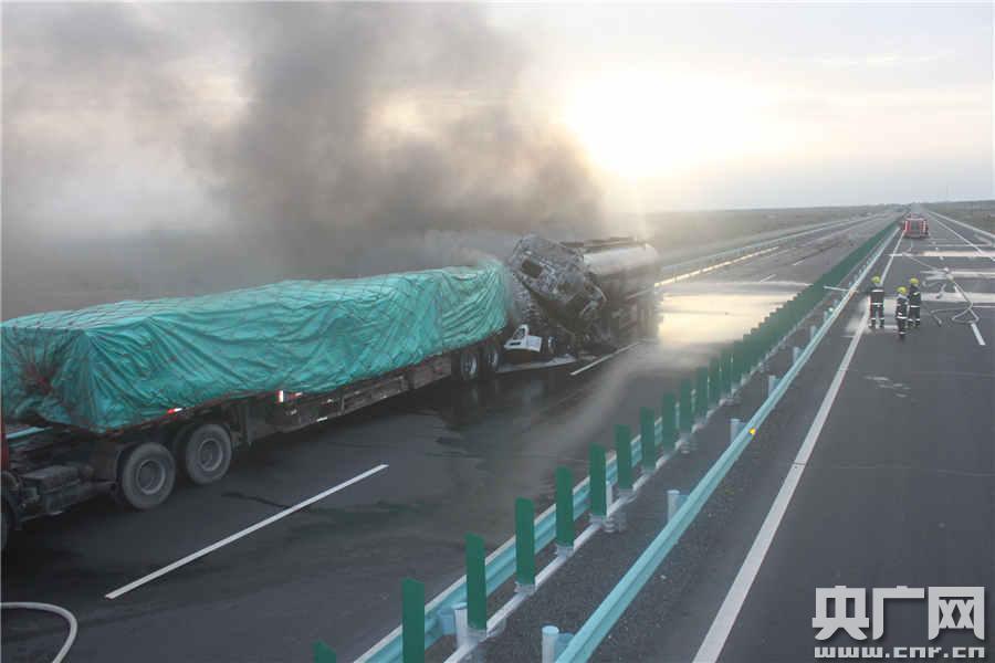 央廣網(wǎng)精河6月13日消息(記者張雷 通訊員賀桂景 陳熙)昨天凌晨6時17分,新疆博爾塔拉蒙古自治州消防支隊(duì)119接警中心接到報警:G30連霍高速3961路段精河往伊犁方向一油罐槽車與重型半掛車追尾起火,內(nèi)有高標(biāo)號甲醇50.4立方米,火勢猛烈,嚴(yán)重威脅到僅距50余米?寇囕v以及下車圍觀群眾。