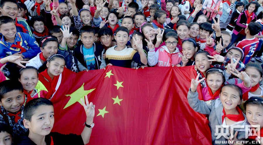 克拉瑪依第五中學(xué)疆內(nèi)初中班的南疆學(xué)生守護(hù)國旗祝福祖國繁榮昌盛(周建玲攝)