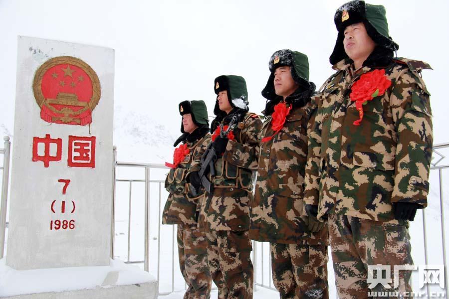 新疆紅其拉甫邊檢站臨退伍老兵向帕米爾高原中巴界碑告別(央廣網(wǎng)記者 張雷 攝)