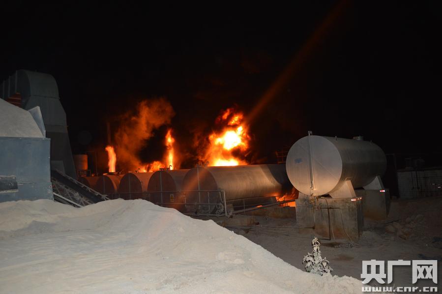 11月26日19時30分,灣甸派出所民警、協(xié)警趕到現(xiàn)場時,現(xiàn)場火光沖天,濃煙滾滾。著火點為2個容量為30噸的瀝青種油加溫罐,火場旁邊有1個裝滿25噸柴油的儲油罐,3個裝滿50噸瀝青的瀝青罐,價值1000多萬元的拌合樓一棟,控制室、配電房等附屬設施若干;饎萦羞M一步向拌合樓、儲油罐蔓延趨勢,一旦火勢燒到儲油罐隨即就要發(fā)生爆炸,后果將不堪設想,現(xiàn)場情況萬分危急。在火災現(xiàn)場,派出所帶隊所領導當機立斷,組織民警、協(xié)警、現(xiàn)場工人30余人實施搶險救援。首先用消防車高壓水槍壓制火勢,不讓其向儲油罐、拌合樓蔓延,避免發(fā)生更大險情。隨后,組織工人用抽水機抽水、沙土掩埋、滅火器撲滅等各種方式同步跟進撲滅明火。同時,在火災現(xiàn)場的兩方道路上,設置警戒線維持現(xiàn)場秩序。