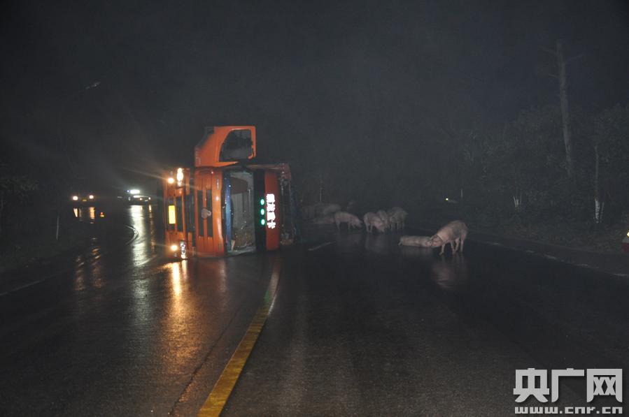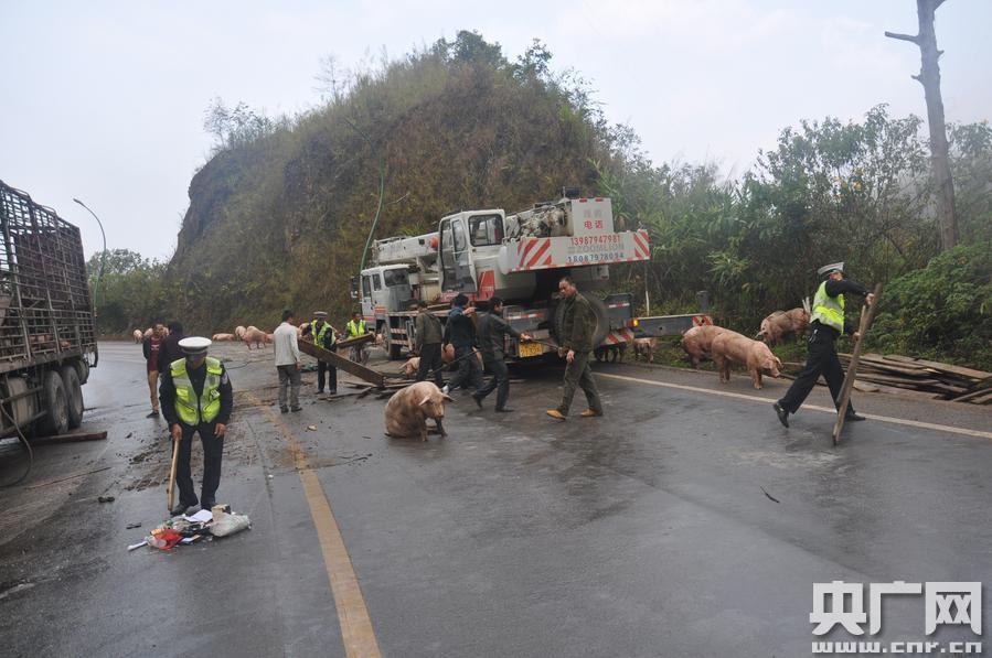 經(jīng)過1個多小時的現(xiàn)場救援處置,翻倒的貨車被清出了道路,161頭生豬在民警的看管下也完好無損,無一丟失。