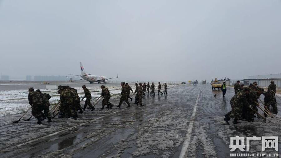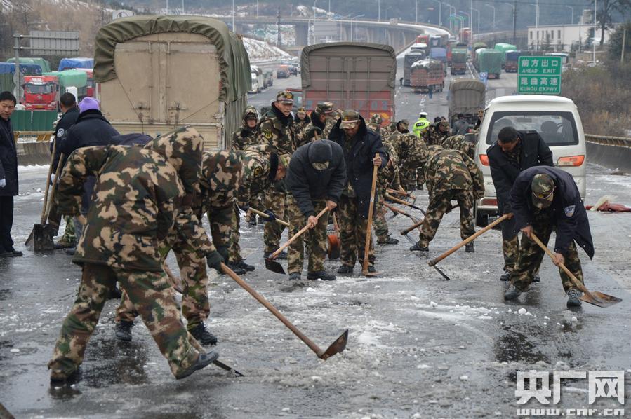 此次冷空氣來襲,導(dǎo)致昆明城區(qū)、昆曲高速、昆玉高速、昆明長水國際機(jī)場等重要地段結(jié)冰,嚴(yán)重影響車輛正常行駛,飛機(jī)無法正常起降。1月24日以來,武警昆明森林支隊立即出動200名官兵兵分兩路火速趕赴受冰雪影響最嚴(yán)重的昆曲高速和昆明長水國際機(jī)場除冰掃雪。