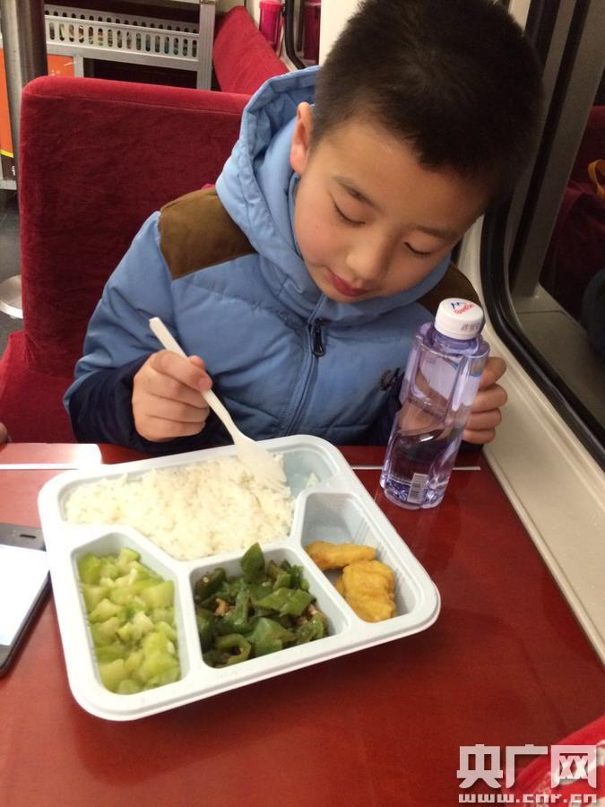 1月25日,在南寧東開往武漢的G432次列車上,乘務(wù)員喻榮走到14車2C座位上時,看到一名10歲兒童自帶盒飯里的米飯大吃一驚,連忙阻止他吃下去。