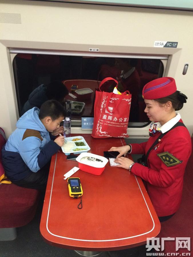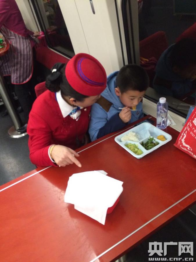 得知小男孩是獨自乘車之后,喻榮一邊安慰小男孩一邊呼叫列車長李婷趕來。此時列車在桂林站剛開車不就,已是晚上6點40分,李婷趕到后看到小男孩饑腸轆轆的樣子,既心酸又心疼。她和喻榮一起將小男孩和行李帶到餐車進行安置,同時將自己的乘務(wù)餐拿出來讓小孩先吃,看著小男孩狼吞虎咽的樣子,李婷的臉上浮現(xiàn)出了開心的笑容。吃過飯后,李婷和小男孩聊起了天,得知小男孩名叫姚熙程,父母都在桂林打工,姐姐在武漢上班,從小到大幾乎沒有出去旅過游。今年寒假來臨,爸爸特地將他送上了到武漢的高鐵,讓姐姐帶他見識下武漢的美麗風光,上車前在超市買了一份他喜歡吃的盒飯,沒成想一掀開米飯都發(fā)了霉,茫然無措的他這才找到乘務(wù)員尋求幫助。說到這里,小熙程的心情又低落了下來。