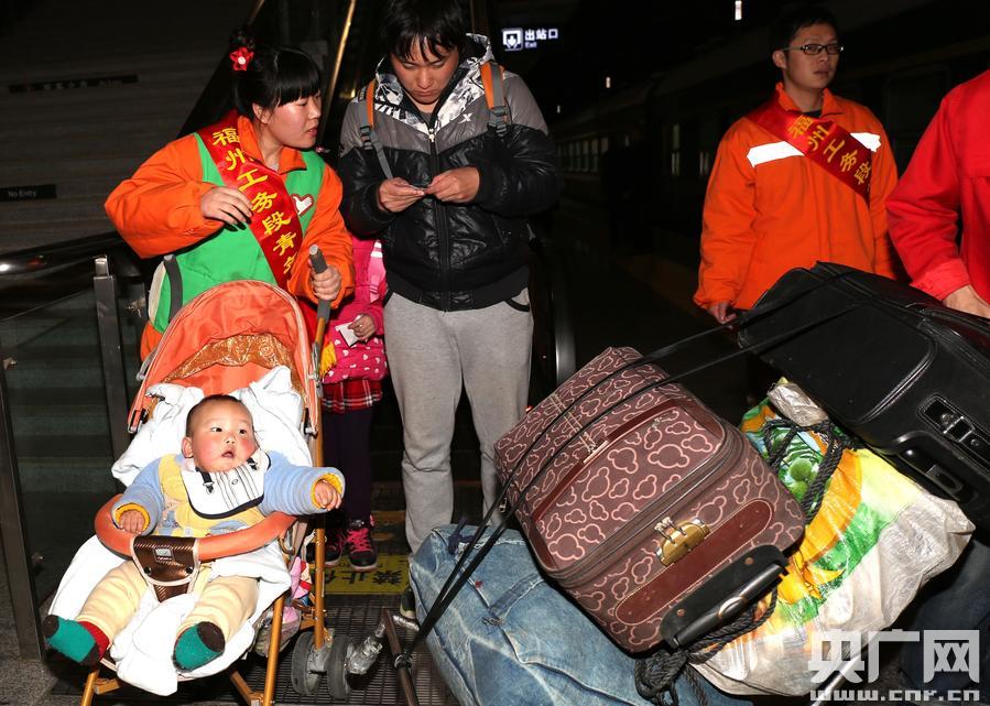央廣網(wǎng)福州1月27日消息(記者 葛朝興 通訊員 雍萬俊 許建勝 )“他們就像閃爍著火焰的桔燈溫暖著我們的回鄉(xiāng)路”。1月26日晚8時(shí),福州開往達(dá)州K4382次列車?吭诟V莼疖囌1號(hào)站臺(tái),當(dāng)進(jìn)站的閘門拉開,乘車的旅客如同滾滾洪流奔騰著,在奔騰的洪流中有群身穿桔黃色防護(hù)服務(wù)身披綬帶的青年在人群中來回穿梭著,他們或是幫助重點(diǎn)旅客扛行李或是幫助旅客照顧孩子,讓歸心似箭的旅客在極寒的返鄉(xiāng)途中多了幾分溫暖,他們就是南昌鐵路局福州工務(wù)段黨團(tuán)員志愿者服務(wù)隊(duì)的青年。