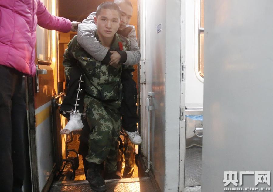 邊檢官兵背越南籍傷員登上國際列車。李順安 攝