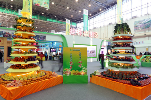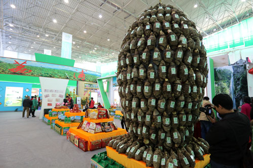 第十一屆廣西名特優(yōu)農(nóng)產(chǎn)品交易會上,參展商將農(nóng)產(chǎn)品擺出各種造型吸引觀眾