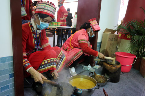 交易會也成為各地展示地方特色的舞臺,圖為恭城“打油茶”表演