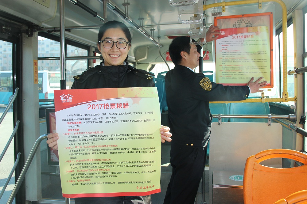 央廣網(wǎng)青島1月18日消息(記者王偉 通訊員朱琰琰)記者從交運(yùn)溫馨巴士公司獲悉,為方便市民購(gòu)票,溫馨巴士公司在新市民客流量較大的隧道3路、隧道4路、隧道7路、隧道8路、605路、606路、608路等數(shù)十條公交線路共200余部車上發(fā)布了汽車票、火車票的“搶票秘笈”。
