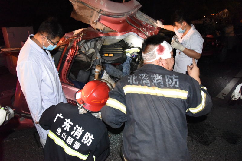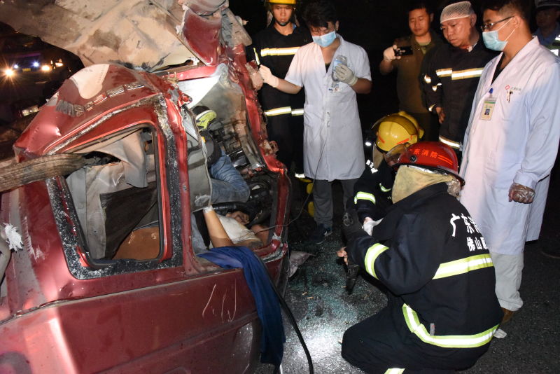 凌晨4時(shí)20分,北滘?qū)B毾狸?duì)趕到現(xiàn)場(chǎng)后,發(fā)現(xiàn)現(xiàn)場(chǎng)出事車(chē)輛為1輛大拖頭貨車(chē),車(chē)上存放一大批質(zhì)量較大的機(jī)器設(shè)備和貨物,當(dāng)行駛到出事地點(diǎn)時(shí),由于司機(jī)剎車(chē)太急,車(chē)身里存放的貨物釋放出巨大的緩沖力并沖向駕駛室,駕駛室瞬間被壓垮,司機(jī)腹部以下身體被卡,根本無(wú)法動(dòng)彈,現(xiàn)場(chǎng)情況十分危急。根據(jù)現(xiàn)場(chǎng)情況,北滘?qū)B毾狸?duì)到場(chǎng)消防隊(duì)員立即展開(kāi)救援行動(dòng):采用操作液壓擴(kuò)張器撐開(kāi)車(chē)頭機(jī)件,找準(zhǔn)鋼索著力點(diǎn),使用消防車(chē)對(duì)駕駛室進(jìn)行牽引,仍無(wú)法打開(kāi)車(chē)門(mén),后采用液壓鉗剪斷車(chē)門(mén)變形部位,操作液壓擴(kuò)張器進(jìn)行撐頂使得方向盤(pán)不再擠壓司機(jī)腹部。隨后,消防隊(duì)員拆除駕駛位座椅,使得施救空間變大,為找準(zhǔn)司機(jī)雙腳受困位置,一名消防隊(duì)員脫下頭盔,探頭尋找司機(jī)受困部位,導(dǎo)致車(chē)內(nèi)金屬機(jī)件刮傷頭部,造成一道約7公分傷口,經(jīng)過(guò)簡(jiǎn)單處理后,再次投身救援。利用液壓擴(kuò)張器進(jìn)行撐頂,最后將司機(jī)雙腳慢慢抽出并成功救出駕駛室,經(jīng)過(guò)兩小時(shí)的緊張救援,北滘?qū)B毾狸?duì)隊(duì)員順利將被困人員救出,并小心翼翼的將傷者抬上擔(dān)架后由醫(yī)護(hù)人員送往醫(yī)院救治。