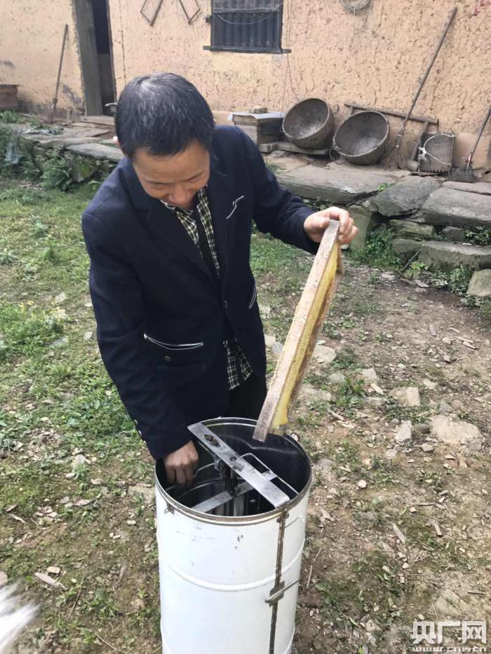 看到記者和工作組的人,老陳趕緊摘掉頭紗迎出來,在南方的很多地方,人們都喜歡搬幾把小凳子坐在門口納涼、喝茶、聊天,老陳家里也不例外,不過他們家里招待朋友,用的是自己家產(chǎn)的蜂蜜,待到我們坐下,老陳八十多歲的母親蹣跚著搬出一罐蜂蜜沖了兩杯端給我們,而老陳則跑到里間屋從抽屜里翻出來一個(gè)紅色的塑料袋,從里面拿出一包明顯珍藏了很久的煙,拆開來分別遞給我和老譚,老譚接過來輕聲用醴陵本地話跟他說了句話,明顯感覺到老陳有點(diǎn)局促不安,不像一個(gè)45歲的人應(yīng)有的人情練達(dá),其實(shí)我來這里一個(gè)多星期,這里的方言我多少能聽懂一點(diǎn),他講的是“你這煙發(fā)霉了”,而老陳的反應(yīng)也很出乎我的意料,在被老譚說了之后,他像一個(gè)犯錯(cuò)的孩子坐回到自己的凳子上。聊天的過程中得知,老陳這些年一直單身,由于家里住的實(shí)在太偏僻,家境又實(shí)在貧窮,說不到媳婦兒,講起這件事,工作組的老譚接過話茬給我講了一件事,去年年底的時(shí)候他們各個(gè)駐村的工作組在一起聊天,剛好有另一個(gè)村的同事說起隔壁村有個(gè)離異的婦女,老譚就有心撮合她和陳建文在一起,就通過微信把照片發(fā)給了老陳,老陳倒是很樂意,不湊巧的是后來得知人家已經(jīng)準(zhǔn)備再婚了,這件事最后也不了了之,說起這件事老陳笑的很靦腆,“沒有讓你穿成短褲。。ó(dāng)?shù)匕颜f媒說成了叫做穿短褲)”,看得出他也很渴望能早點(diǎn)結(jié)婚,組成一個(gè)完整的家庭,當(dāng)被問到這些年不結(jié)婚的原因時(shí),老陳點(diǎn)了一支煙,用不太標(biāo)準(zhǔn)的普通話說“住在這里,都不愿意來,也沒有錢啊”,老譚趕緊勸他“不用擔(dān)心,你看你現(xiàn)在養(yǎng)這么多的蜜蜂,能掙很多錢,等年底住到下面的集中安置點(diǎn),就說個(gè)媳婦兒,都會(huì)好的”。說到養(yǎng)蜂,老陳的話明顯多了起來,“我已經(jīng)養(yǎng)蜂養(yǎng)了十幾年了,從去年來擴(kuò)大了點(diǎn)規(guī)模,現(xiàn)在山上的加上水庫那邊能有60多桶(箱)”他說。當(dāng)記者提出想看看他怎么把蜂蜜從箱子里面弄出來時(shí),老陳很麻利的搬出一個(gè)白色的大桶。