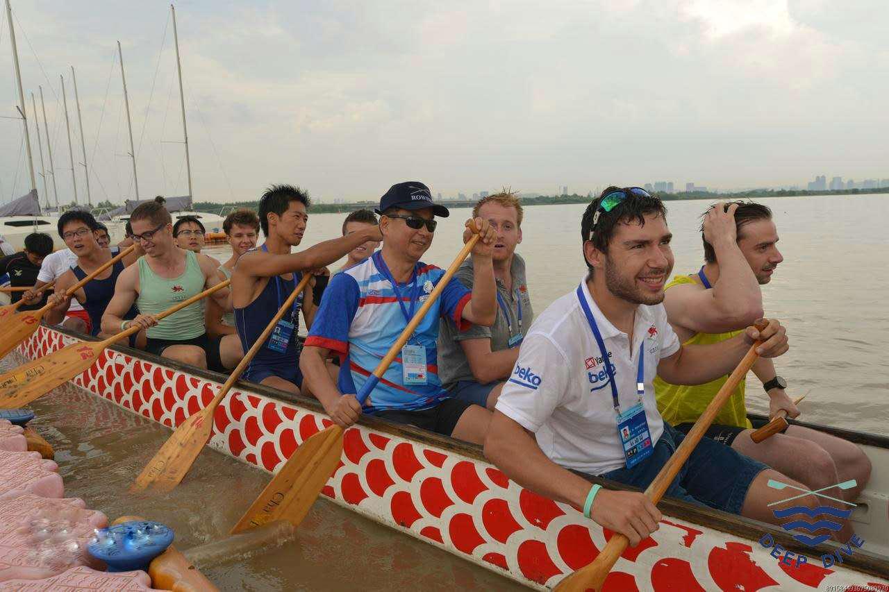賽艇賽后是龍舟表演賽,以國內(nèi)賽隊為代表的大師隊和各國大學(xué)生云集的大學(xué)生隊進行了現(xiàn)場龍舟競技。隨著裁判發(fā)令槍響,原本平靜的江面立刻熱鬧起來,龍舟上的鼓手掄起兩個鼓槌同時猛擊大鼓,指揮著龍舟快速劃出起點。船槳同時切入水中,運動員們齊聲喊著號子,奮勇劃槳,動作整齊劃一。飛濺的浪花,飛馳的龍舟,鼓聲、吶喊聲,與岸上的歡樂氣氛交相輝映,構(gòu)成了一幅千帆競逐的畫面。