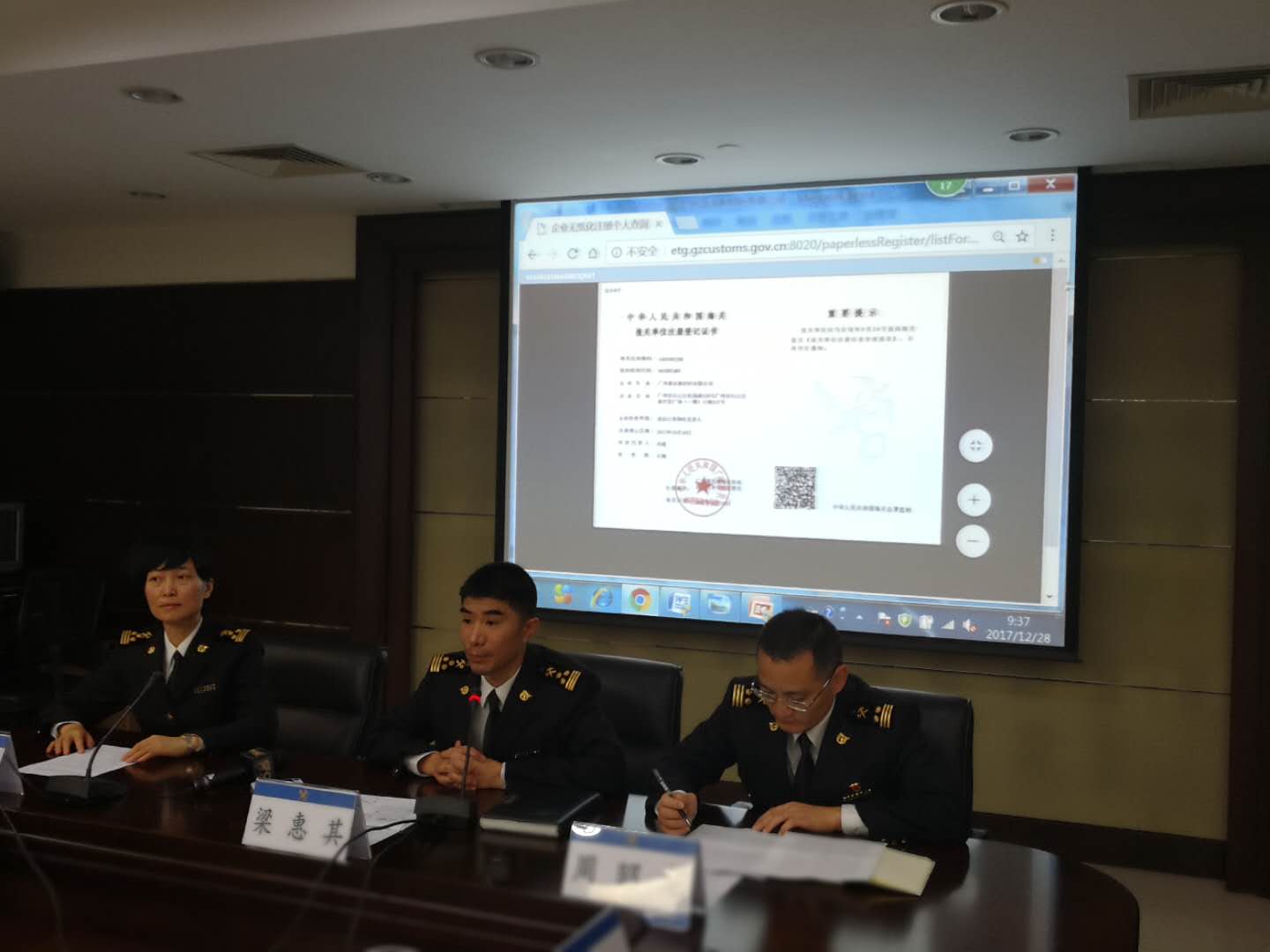 央廣網(wǎng)廣州12月28日消息(記者鄭澍 通訊員關(guān)悅)廣州海關(guān)28日召開新聞發(fā)布會(huì)通報(bào)“先行先試”推進(jìn)企業(yè)注冊(cè)登記“無(wú)紙化”改革情況,廣州海關(guān)企業(yè)管理處處長(zhǎng)梁惠其現(xiàn)場(chǎng)展示了全國(guó)第一張報(bào)關(guān)單位注冊(cè)登記的電子證書。從明年始,廣州海關(guān)將正式實(shí)施企業(yè)注冊(cè)登記“無(wú)紙化”,在全國(guó)率先推出全流程“無(wú)紙化”+“電子印章”服務(wù)。廣州海關(guān)通過“線上海關(guān)”系統(tǒng)對(duì)接廣州市商事主體信息平臺(tái),實(shí)現(xiàn)企業(yè)信息數(shù)據(jù)的自動(dòng)對(duì)碰,企業(yè)隨時(shí)隨地通過互聯(lián)網(wǎng)遠(yuǎn)程向廣州海關(guān)申請(qǐng)辦理海關(guān)注冊(cè)登記手續(xù),系統(tǒng)審核通過后會(huì)自動(dòng)加蓋電子印章,企業(yè)可以在線領(lǐng)取電子版注冊(cè)證書并打印,也可到海關(guān)辦事窗口領(lǐng)取,或由海關(guān)通過免費(fèi)的郵政速遞寄達(dá)。