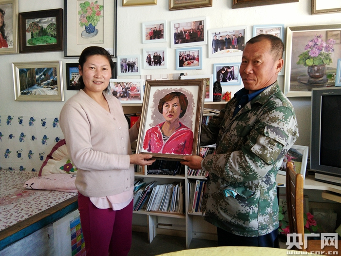“我把你畫得美不美?大眼睛、紅嘴唇的!”初夏時(shí)節(jié),吉木薩爾縣新地鄉(xiāng)小分子村野花遍地,景色怡人。村民馬生喜捧起剛剛畫好的肖像畫,送給妻子張紅。馬生喜說:“剛開始就畫些草、牛羊,最后就想的畫一下人物。就讓我媳婦當(dāng)模特,媳婦是我心目中最美的,我想的就把我媳婦畫得更美,更漂亮!