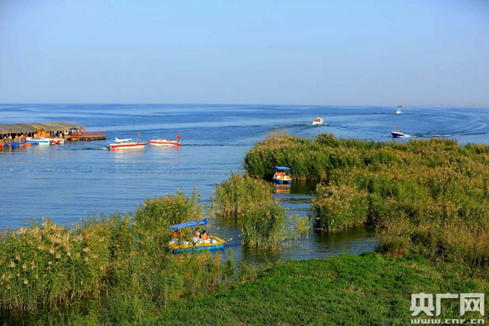 游客乘船暢游在新疆巴州博斯騰湖(央廣網(wǎng)發(fā) 年磊 攝)