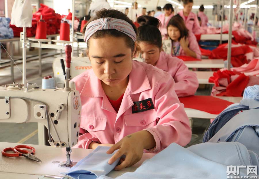 村民們?cè)趲燔嚶∶蓝喾椨邢薰緦?shí)現(xiàn)了就業(yè),趕制訂單服飾。