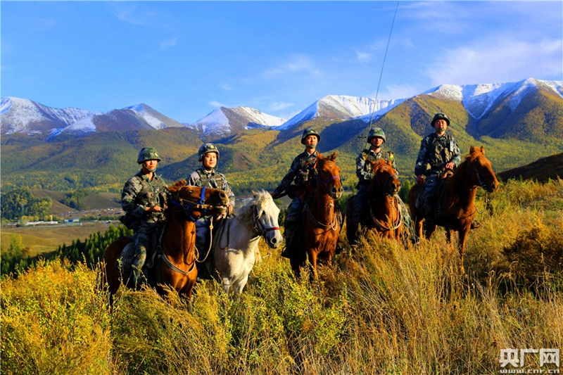駐新疆邊防某部官兵乘馬在中哈邊境一線巡邏執(zhí)勤,守邊護(hù)防。(央廣網(wǎng)記者 李建峰攝)