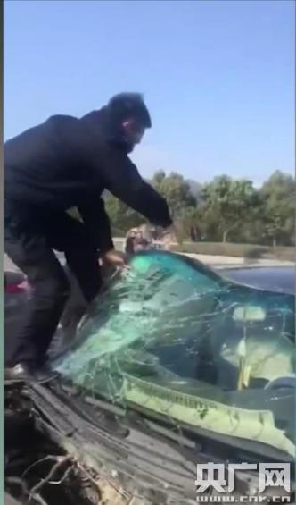 擋風(fēng)玻璃被砸碎裂后,卻仍與防爆膜緊緊粘連成一體,裘飛龍用手將已經(jīng)碎裂的車玻璃一塊塊撕下,雖然旁邊不斷有人提醒小心被碎玻璃割傷,但他卻沒(méi)有絲毫猶豫,迅速將玻璃撕開(kāi)一個(gè)大洞。