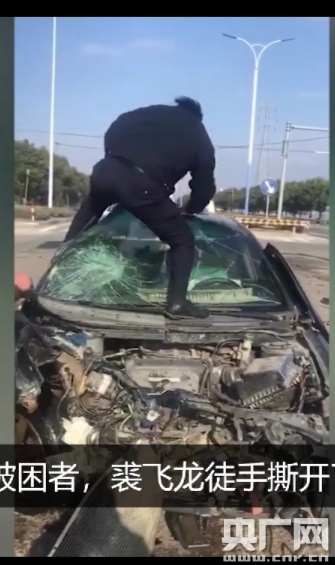 裘飛龍?jiān)儐?wèn)周邊目擊者得知駕駛員仍被困車內(nèi),車門因變形無(wú)法打開(kāi),便徑直跳上引擎蓋,嘗試徒手撕開(kāi)車輛前擋風(fēng)玻璃。