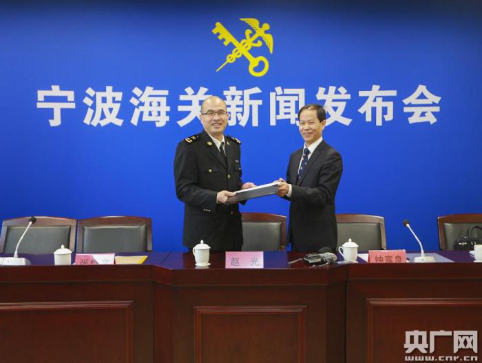 聯(lián)合石化副總經(jīng)理鐘富良向?qū)幉êjP(guān)副關(guān)長趙光遞交保函(央廣網(wǎng)發(fā) 寧波海關(guān)供圖)