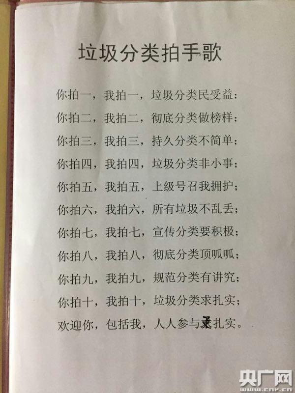 圖為丹頂鶴社區(qū)志愿者自創(chuàng)的垃圾分類拍手歌(央廣網(wǎng)發(fā) 圖片由社區(qū)提供)
