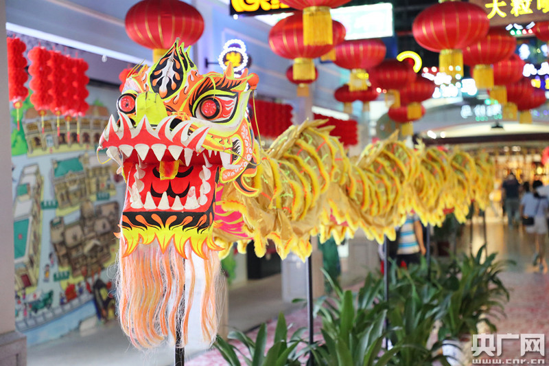 位于5樓中庭展出的一頭巨無霸“南獅王”尤為吸引眼球,據(jù)介紹,該獅頭直徑2米,由廣東醒獅傳承人趙偉斌監(jiān)制、獅頭扎作傳承人陳意明扎作,制作考究、色彩絢麗、富麗堂皇。