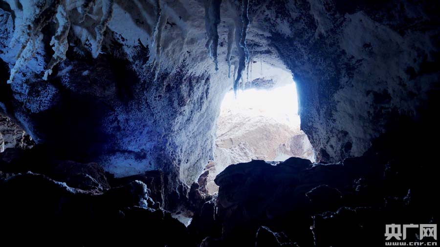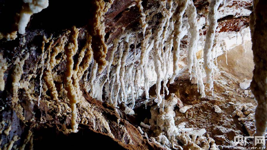 而拜城縣的這座巖鹽溶洞卻是另外一種地貌地質(zhì)。范延賓說:“比如說,像這根鹽鐘乳來說的話,它長大概是80公分,估計它的這種形成,估計8到10年左右,這個速度比石灰?guī)r地區(qū)的喀斯特地貌的石鐘乳要快得多,根據(jù)資料顯示的話,這個石灰?guī)r地方的石鐘乳它的形成也就是,每年大概0.1到3毫米左右!