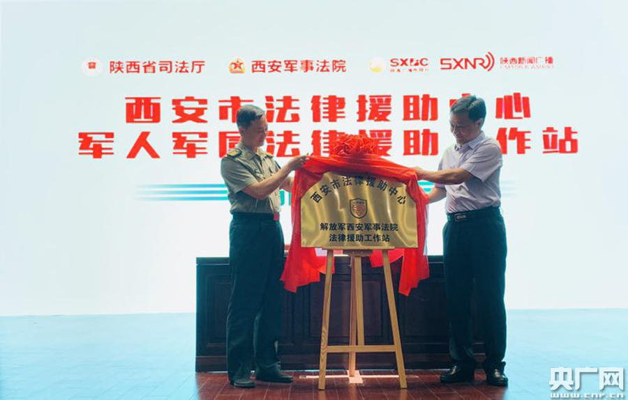 陜西省司法廳副廳長李艾平、中國人民解放軍西安軍事法院院長賈勝軍共同為“解放軍西安軍事法院法律援助工作站”揭牌并分別講話。