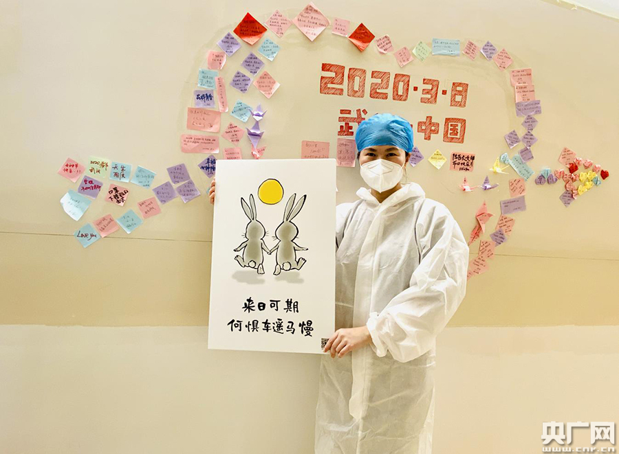 唐棠副護(hù)士長(zhǎng)捧著一張寫有“來(lái)日可期,何懼車遙馬慢”的漫畫說(shuō)到:“勝利就在眼前,我們一定要不麻痹、不厭戰(zhàn)、不松勁,慎終如始,全力救治患者!”