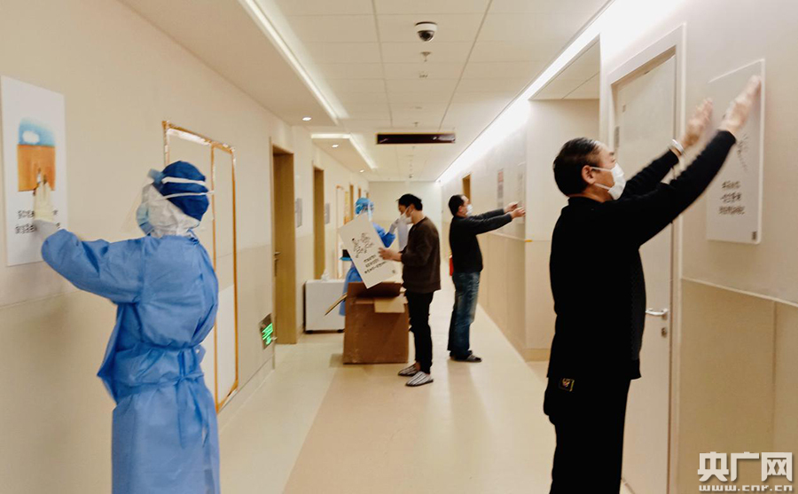 醫(yī)護(hù)人員與患者在隔離病區(qū)精心布置漫畫(央廣網(wǎng)發(fā) 通訊員曾理 攝)