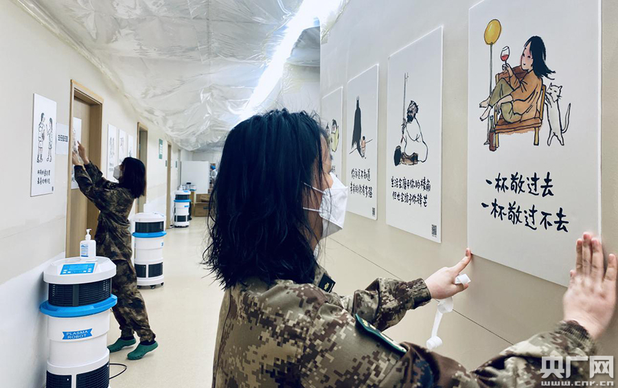 醫(yī)護(hù)人員在工作區(qū)精心布置治愈系漫畫(央廣網(wǎng)發(fā) 通訊員曾理 攝)