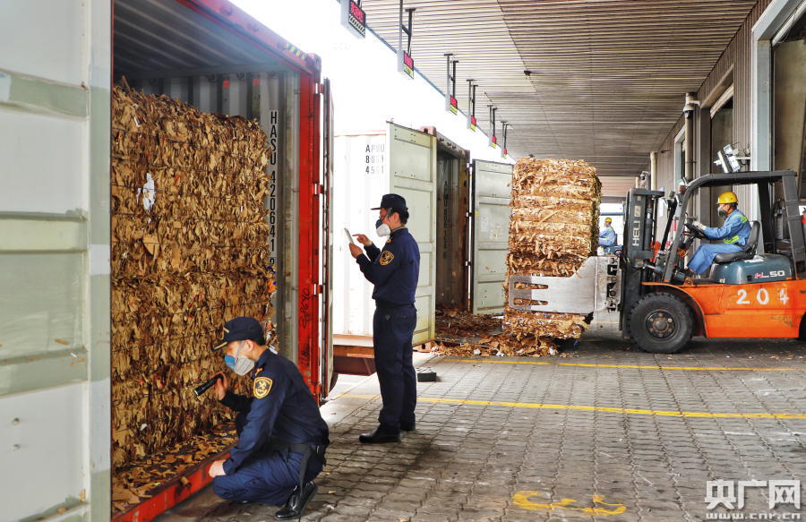 海關(guān)關(guān)員對進口廢紙進行查驗(王軼星 攝)