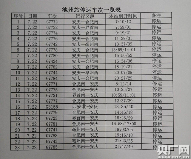 央廣網(wǎng)合肥7月22日消息(記者梁明星)記者剛剛從鐵路部門獲悉,因合福高鐵線路受巢湖水位上漲影響,繼7月21日池州、安慶、銅陵等地火車站與合肥南站之間多趟高鐵班次臨時(shí)停運(yùn)后,7月22日,池州、安慶、銅陵等地與合肥南站之間的多趟高鐵班次繼續(xù)處于臨時(shí)停運(yùn)狀態(tài)。