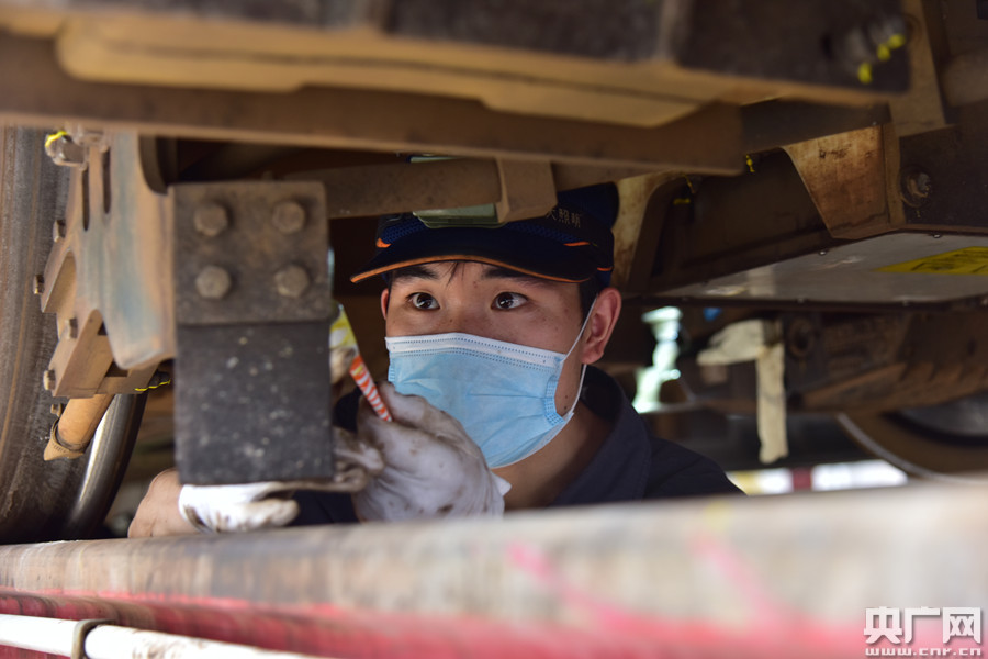 重慶北動(dòng)車所動(dòng)車機(jī)械師正大為動(dòng)車組涂打防松標(biāo)記(央廣網(wǎng)發(fā) 通訊員陳亞 攝)