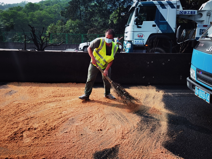 截至5日下午4點(diǎn),廣韶高速養(yǎng)護(hù)人員共使用木屑50袋,共計(jì)1000公斤,對(duì)近4000平方米的油污路面進(jìn)行清理,現(xiàn)已清理完畢。