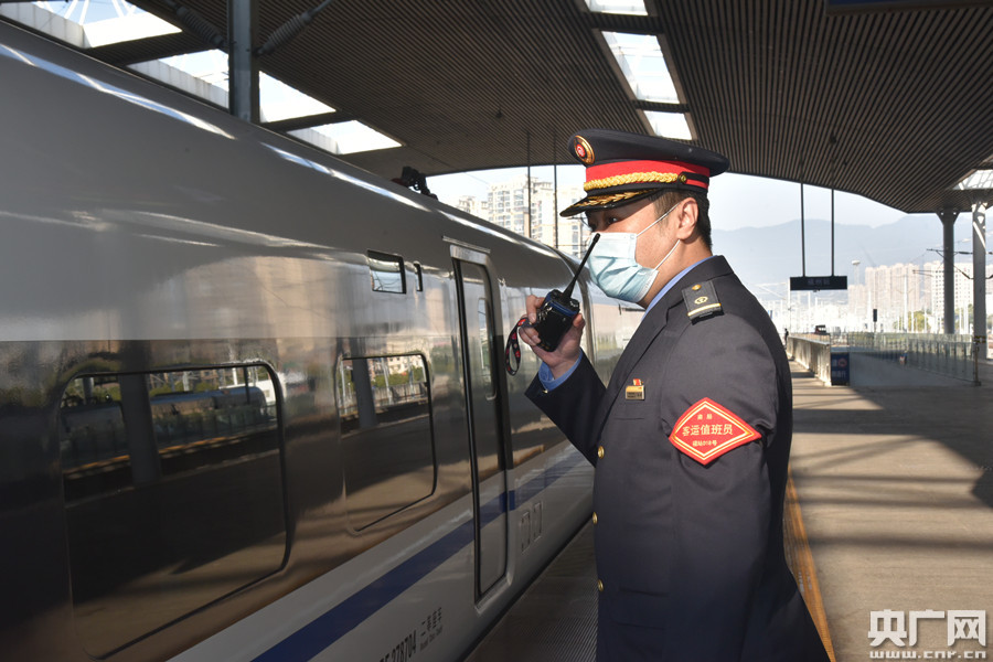 張海,是福州火車站客運(yùn)車間的一名客運(yùn)值班員,當(dāng)記者見(jiàn)到他的時(shí)候,他正在檢票口忙著疏導(dǎo)秩序!昂竺娴穆每筒灰獢D,時(shí)間來(lái)得及,大家要戴好口罩,保持一米間距”、“請(qǐng)?zhí)崆鞍焉矸葑C準(zhǔn)備好,閘門開(kāi)啟后再往前走”“帶孩子的旅客,請(qǐng)孩子在前、大人在后,閘門開(kāi)啟后要快速通過(guò)”……列車停止檢票后,張海又和同事交待了一下做了停檢后的注意事項(xiàng),這才有空轉(zhuǎn)過(guò)身來(lái)和記者聊了起來(lái)。