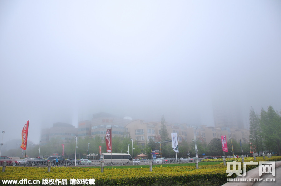 2015年4月30日下午,青島香港中路,本來晴朗的天空突然飄來濃濃的平流霧,一時(shí)間眾多高樓大廈都被大霧圍繞,不見了樓頂,猶如天柱聳入云中,仿佛置身“仙境”。