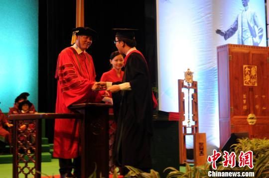 4日,中山大學(xué)舉行2015屆畢業(yè)典禮暨2015年學(xué)位授予儀式,圖為校長(zhǎng)羅俊向畢業(yè)生授予學(xué)位。 崔煜坤 攝