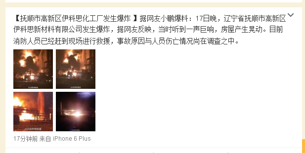 撫順市高新區(qū)伊科思化工廠發(fā)生爆炸