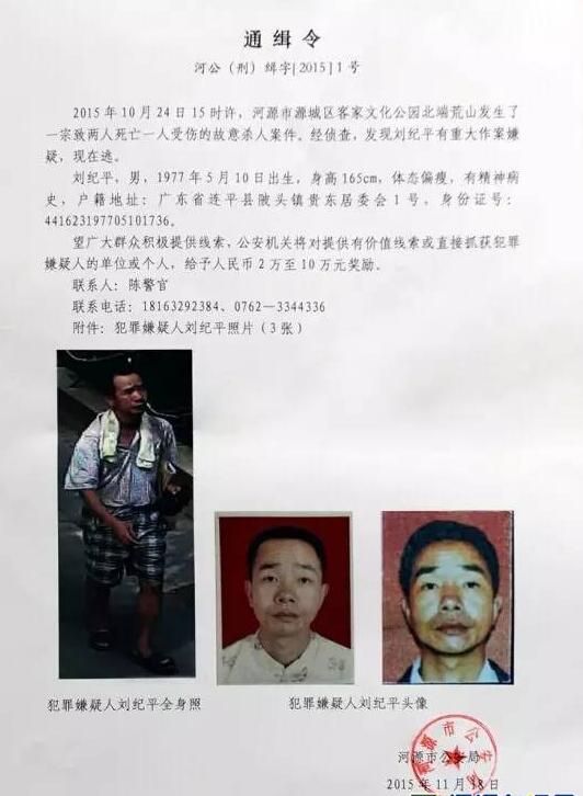 2015年11月19日,河源警方發(fā)布懸賞通告,對提供線索或直接抓獲疑犯劉紀(jì)平的單位或個(gè)人,將給予人民幣2萬至10萬元獎(jiǎng)勵(lì)。