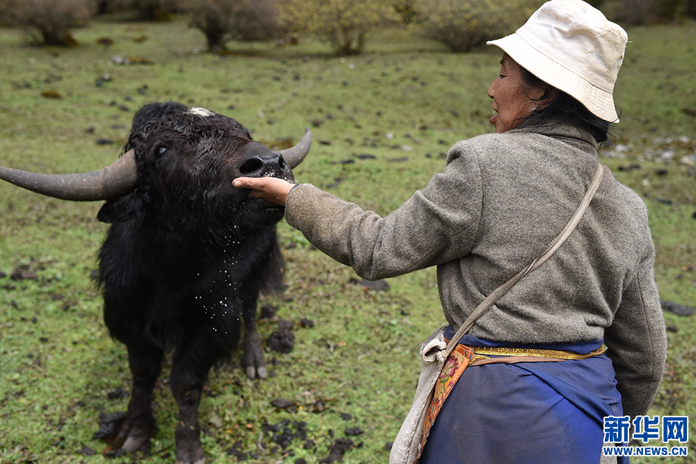 玉麥鄉(xiāng)老鄉(xiāng)長(zhǎng)卓嘎在山上喂牛(5月9日攝)。在上個(gè)世紀(jì)長(zhǎng)達(dá)五十年的時(shí)間里,卓嘎和父親桑杰曲巴、妹妹央宗一家兩代人在玉麥放牧守邊,默默守護(hù)祖國(guó)邊境。今年,卓嘎作為十三屆全國(guó)人大代表走進(jìn)了人民大會(huì)堂。新華網(wǎng)記者 馬藝萌 攝
