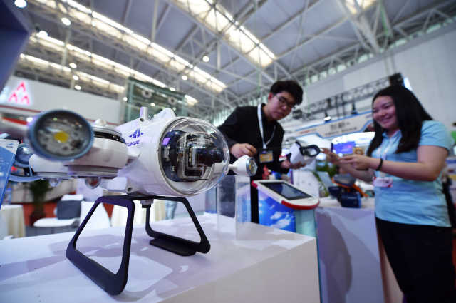 5月17日,觀眾在天津梅江會展中心智能科技展上參觀深之藍(lán)的水下機(jī)器人。新華社記者 李然 攝